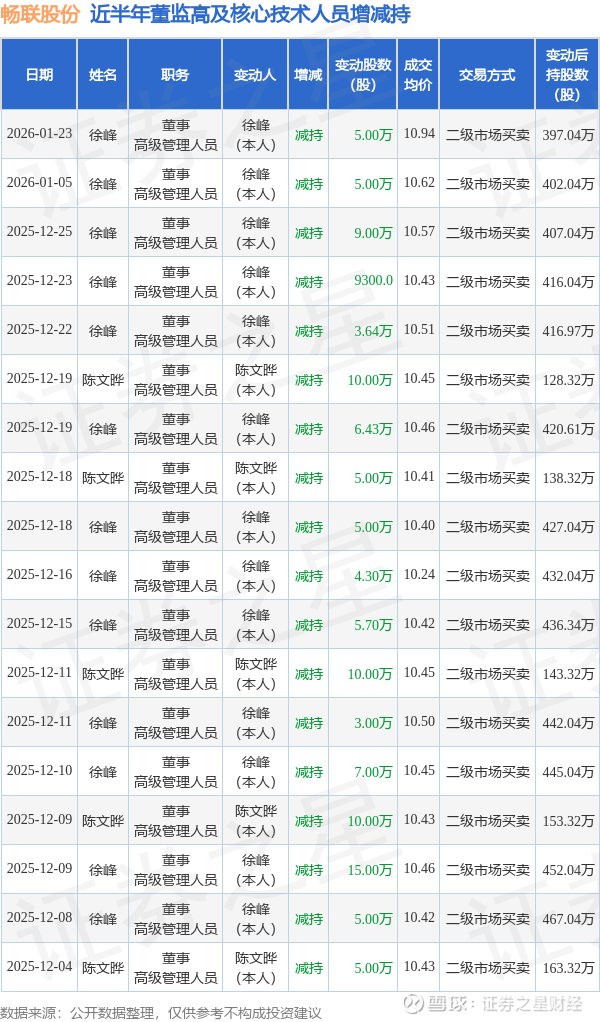 畅联股份近半年内的董监高及核心技术人员增减持详情如下: