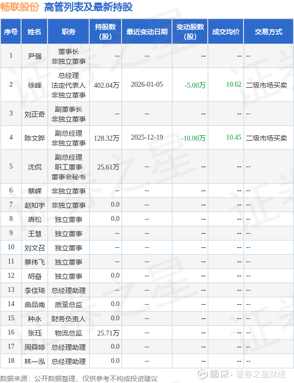 畅联股份的高管列表及最新持股情况如下: