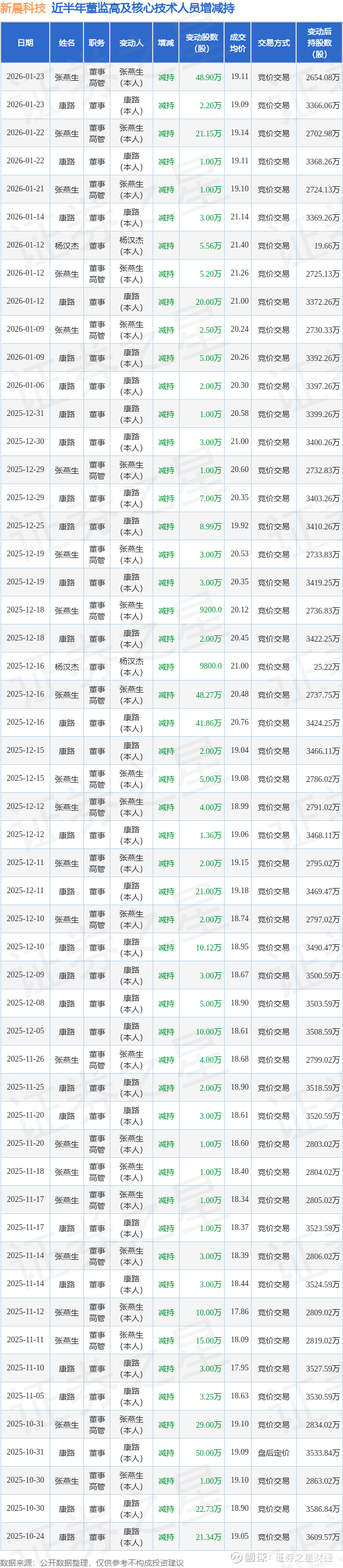 新晨科技近半年内的董监高及核心技术人员增减持详情如下: