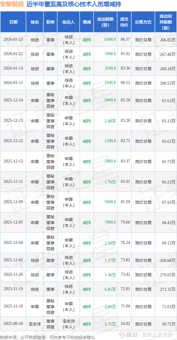 安联锐视近半年内的董监高及核心技术人员增减持详情如下: