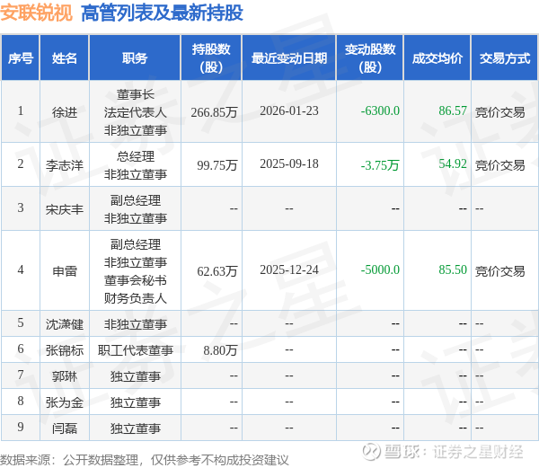 安联锐视的高管列表及最新持股情况如下: