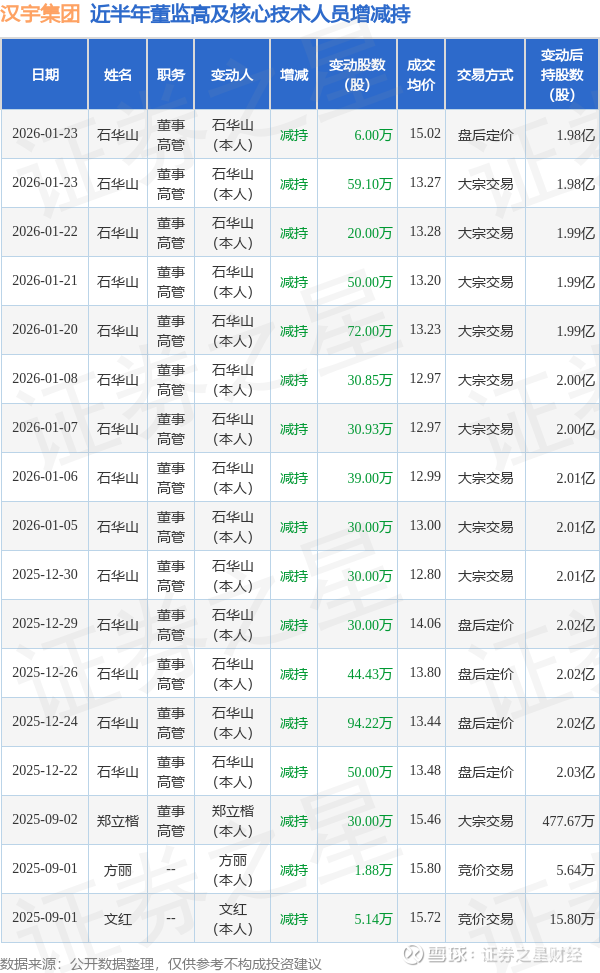 汉宇集团近半年内的董监高及核心技术人员增减持详情如下: