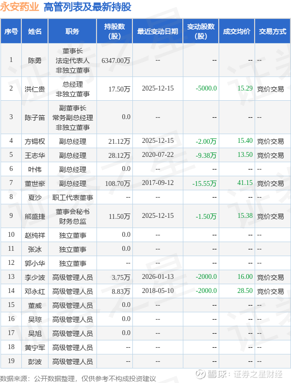 永安药业的高管列表及最新持股情况如下: