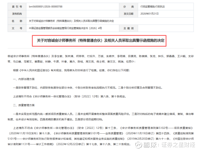 2026年开年不满一个月,容诚会计师事务所(特殊普通合伙)就遭遇了连环处罚事件。1月16日,深交所对容诚所及3名签字注册会计师予以通报批评;仅时隔5天,安徽证监局再发警示函,对容诚所及27名注册会计师同步追责,创近年行业单批次追责人数纪录。