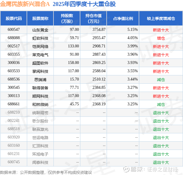 金鹰民族新兴混合A的前十大重仓股如下: