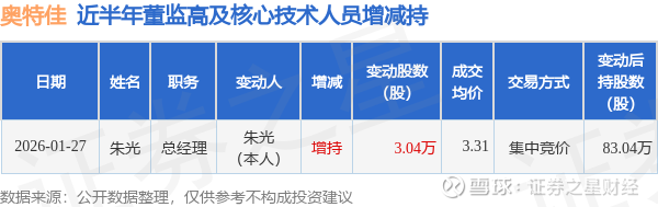证券之星消息,根据1月27日市场公开信息、上市公司公告及交易所披露数据整理,奥特佳(002239)最新董监高及相关人员股份变动情况:2026年1月27日公司总经理朱光共增持公司股份3.04万股,占公司总股本为0.0009%。变动期间公司股价上涨0.3%,1月27日当日收盘报3.32元。