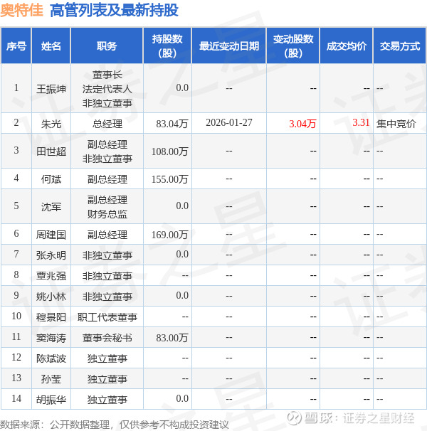 奥特佳近半年内的董监高及核心技术人员增减持详情如下: