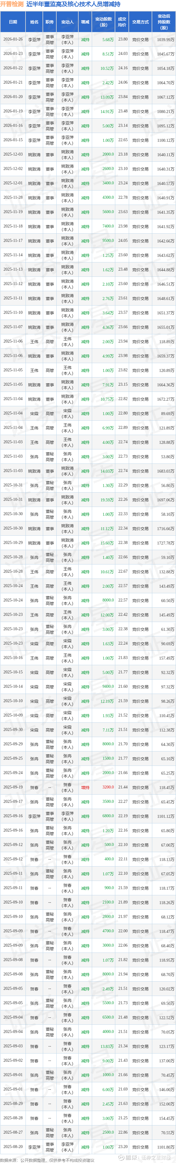 开普检测近半年内的董监高及核心技术人员增减持详情如下: