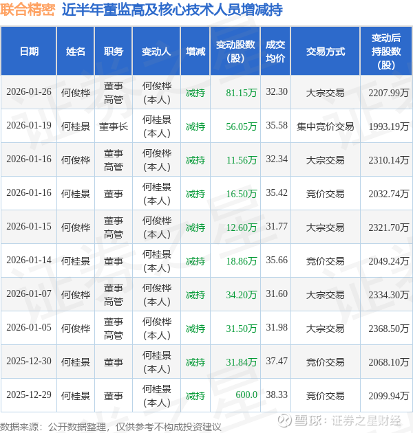 联合精密近半年内的董监高及核心技术人员增减持详情如下: