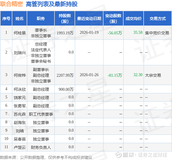 联合精密的高管列表及最新持股情况如下: