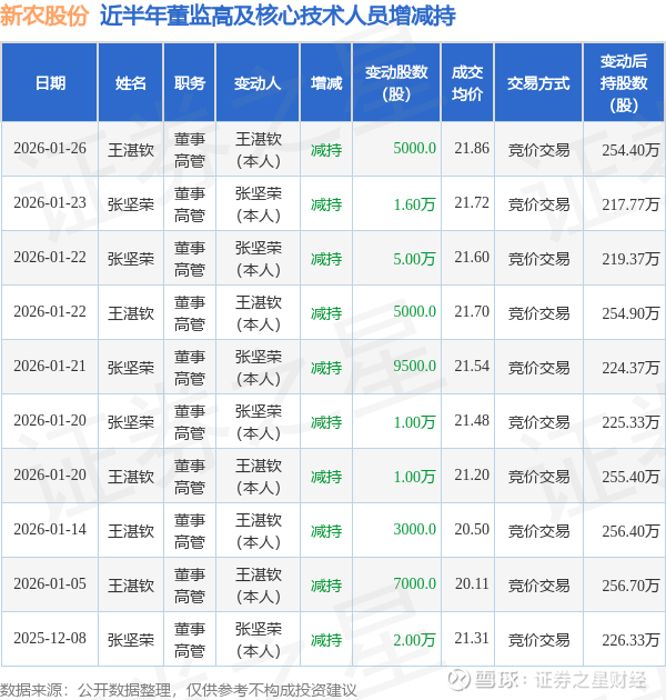 新农股份近半年内的董监高及核心技术人员增减持详情如下: