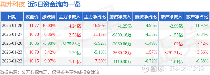 证券之星消息,再升科技1月28日涨停收盘,收盘价11.77元。该股于13点59分涨停,未打开涨停,截止收盘封单资金为1.46亿元,占其流通市值1.08%。