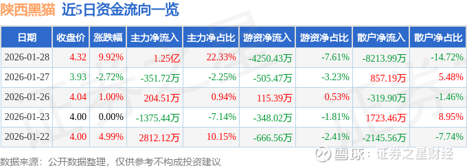 证券之星消息,陕西黑猫1月28日涨停收盘,收盘价4.32元。该股于13点59分涨停,2次打开涨停,截止收盘封单资金为2149.68万元,占其流通市值0.24%。