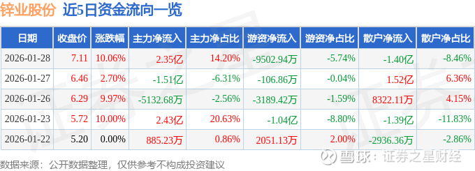 证券之星消息,锌业股份1月28日涨停收盘,收盘价7.11元。该股于10点6分涨停,2次打开涨停,截止收盘封单资金为1.17亿元,占其流通市值1.17%。
