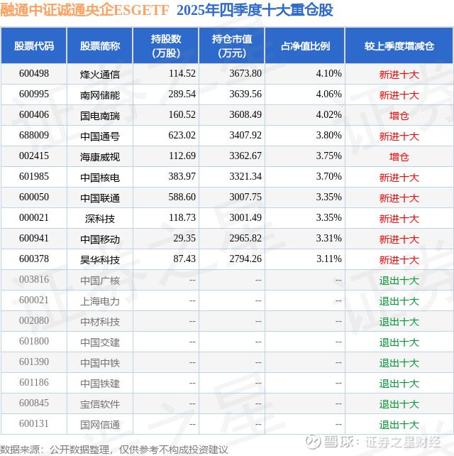 融通中证诚通央企ESGETF的前十大重仓股如下: