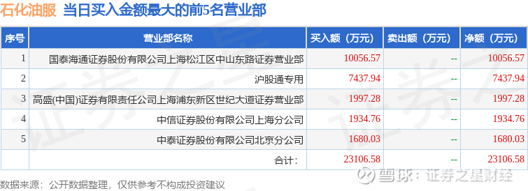 证券之星消息,沪深交易所2026年1月28日公布的交易公开信息显示,石化油服(600871)因有价格涨跌幅限制的日收盘价格涨幅偏离值达到7%的前五只证券登上龙虎榜。此次是近5个交易日内第1次上榜。