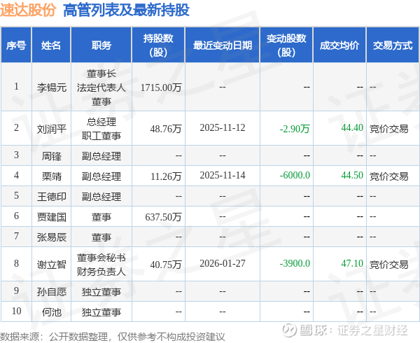 证券之星消息,根据1月28日市场公开信息、上市公司公告及交易所披露数据整理,速达股份(001277)最新董监高及相关人员股份变动情况:2026年1月27日公司董秘,高管谢立智共减持公司股份3900.0股,占公司总股本为0.0051%。变动期间公司股价下跌6.8%,1月27日当日收盘报43.16元。