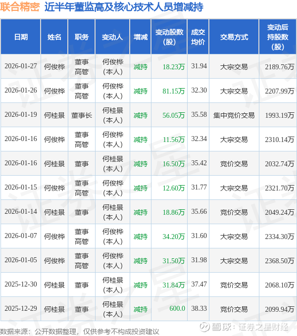 联合精密近半年内的董监高及核心技术人员增减持详情如下: