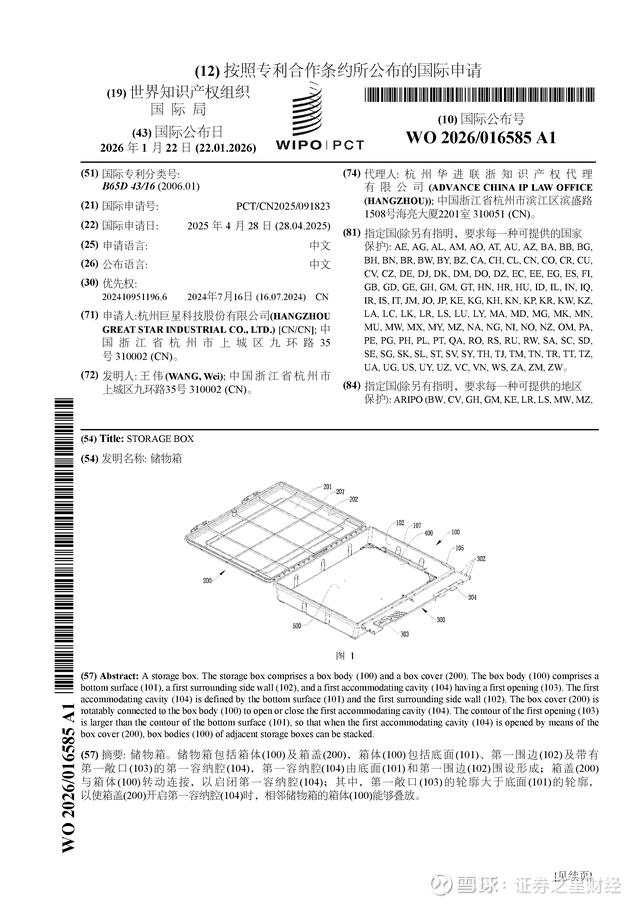 证券之星消息,根据企查查数据显示巨星科技(002444)公布了一项国际专利申请,专利名为“储物箱”,专利申请号为PCT/CN2025/091823,国际公布日为2026年1月22日。