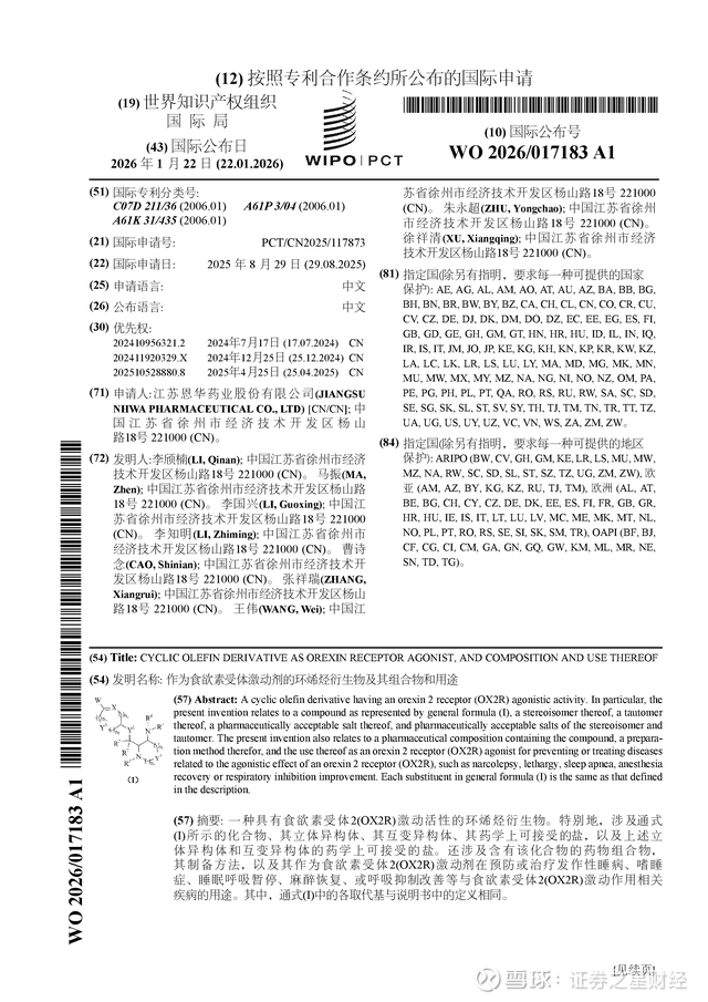 证券之星消息,根据企查查数据显示恩华药业(002262)公布了一项国际专利申请,专利名为“作为食欲素受体激动剂的环烯烃衍生物及其组合物和用途”,专利申请号为PCT/CN2025/117873,国际公布日为2026年1月22日。