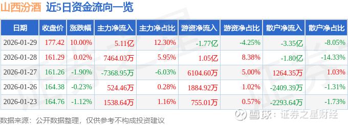 证券之星消息,山西汾酒1月29日涨停收盘,收盘价177.42元。该股于14点34分涨停,4次打开涨停,截止收盘封单资金为7981.61万元,占其流通市值0.04%。