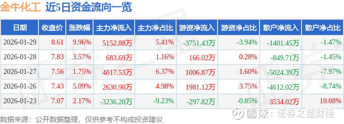 证券之星消息,金牛化工1月29日涨停收盘,收盘价8.61元。该股于14点38分涨停,3次打开涨停,截止收盘封单资金为294.11万元,占其流通市值0.05%。
