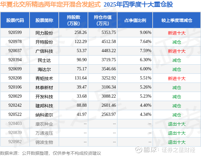 根据2025基金年报公募基金重仓股数据,重仓该股的公募基金共7家,其中持有数量最多的公募基金为华夏基金的华夏北交所精选两年定开混合发起式。华夏北交所精选两年定开混合发起式目前规模为5.91亿元,最新净值2.679(1月28日),较上一交易日上涨0.15%,近一年上涨92.24%。该公募基金现任基金经理为顾鑫峰。顾鑫峰在任的基金产品包括:华夏成长精选6个月定开混合A,管理时间为2020年6月12日至今,期间收益率为48.91%;华夏核心制造混合A,管理时间为2024年12月23日至今,期间收益率为37.35%;华夏新兴经济一年持有混合A,管理时间为2026年1月13日至今,期间收益率为-0.39%。