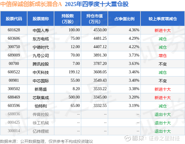 根据2025基金年报公募基金重仓股数据,重仓该股的公募基金共9家,其中持有数量最多的公募基金为中信保诚基金的中信保诚创新成长混合A。中信保诚创新成长混合A目前规模为7.51亿元,最新净值3.4649(1月28日),较上一交易日上涨0.05%,近一年上涨37.94%。该公募基金现任基金经理为王睿。王睿在任的基金产品包括:中信保诚优胜精选混合A,管理时间为2015年4月30日至今,期间收益率为92.56%;中信保诚精萃成长混合A,管理时间为2015年5月29日至今,期间收益率为112.46%;中信保诚前瞻优势混合,管理时间为2021年10月26日至今,期间收益率为7.79%。