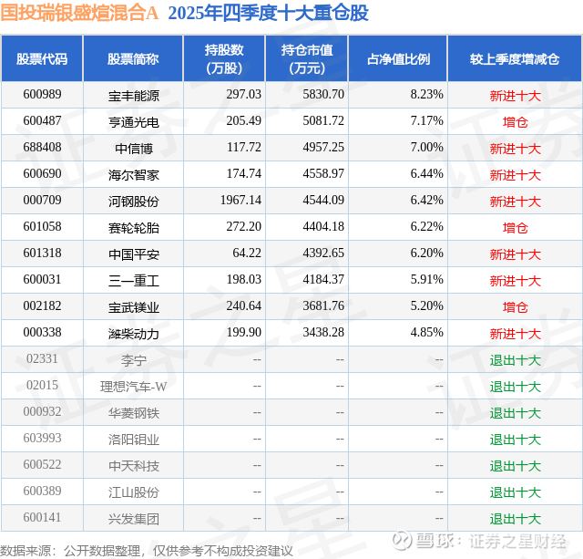 根据2025基金年报公募基金重仓股数据,重仓该股的公募基金共5家,其中持有数量最多的公募基金为国投瑞银基金的国投瑞银盛煊混合A。国投瑞银盛煊混合A目前规模为5.17亿元,最新净值1.8914(1月28日),较上一交易日上涨1.3%,近一年上涨53.75%。该公募基金现任基金经理为周思捷。周思捷在任的基金产品包括:国投瑞银境煊灵活配置混合A,管理时间为2021年4月28日至今,期间收益率为58.81%;国投瑞银开放视角精选混合A,管理时间为2022年6月29日至今,期间收益率为31.22%;国投瑞银美丽中国混合A,管理时间为2023年5月30日至今,期间收益率为32.87%;国投瑞银瑞盈混合(LOF)A,管理时间为2023年5月30日至今,期间收益率为38.5%。
