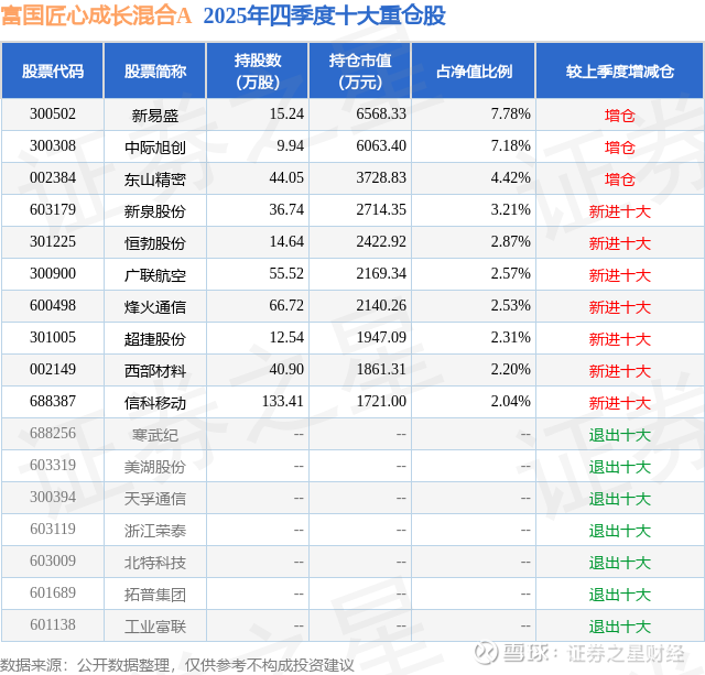 富国匠心成长混合A的前十大重仓股如下:
