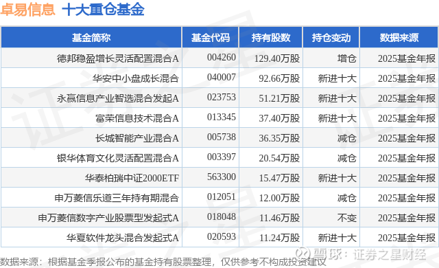 根据2025基金年报公募基金重仓股数据,重仓该股的公募基金共20家,其中持有数量最多的公募基金为德邦基金的德邦稳盈增长灵活配置混合A。德邦稳盈增长灵活配置混合A目前规模为0.46亿元,最新净值1.2521(1月28日),较上一交易日下跌1.7%,近一年上涨28.03%。该公募基金现任基金经理为雷涛 陆阳。雷涛在任的基金产品包括:德邦半导体产业混合发起式A,管理时间为2021年12月28日至今,期间收益率为129.41%;德邦福鑫灵活配置混合A,管理时间为2023年10月13日至今,期间收益率为27.38%;德邦科技创新一年定开混合A,管理时间为2023年10月13日至今,期间收益率为37.04%。陆阳在任的基金产品包括:德邦鑫星价值灵活配置混合A,管理时间为2024年1月30日至今,期间收益率为294.37%;德邦高端装备混合发起式A,管理时间为2025年3月14日至今,期间收益率为30.62%。