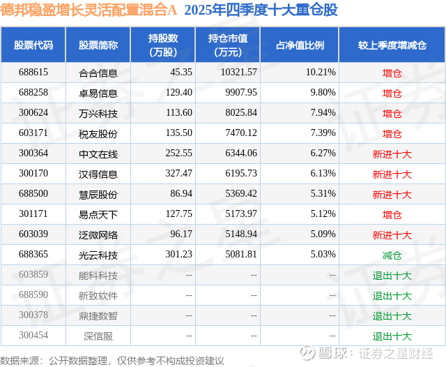 德邦稳盈增长灵活配置混合A的前十大重仓股如下: