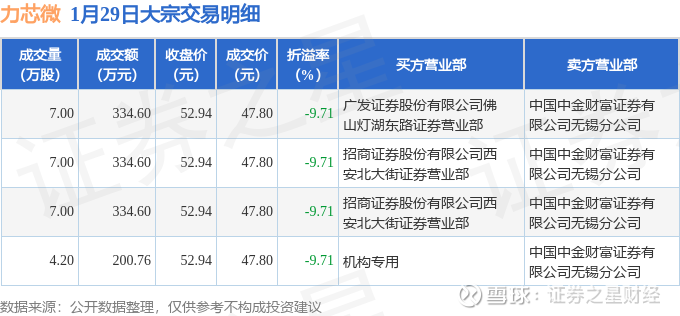 证券之星消息,1月29日力芯微发生大宗交易,交易数据如下: