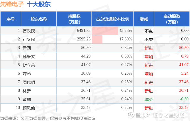 根据先锋电子2025年三季报公布的十大股东详情如下: