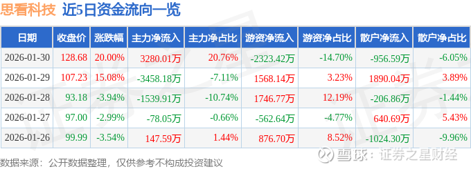 1月30日的资金流向数据方面,主力资金净流入3280.01万元,占总成交额20.76%,游资资金净流出2323.42万元,占总成交额14.7%,散户资金净流出956.59万元,占总成交额6.05%。