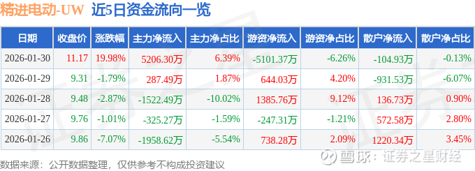 证券之星消息,精进电动1月30日涨停收盘,收盘价11.17元。该股于13点40分涨停,1次打开涨停,截止收盘封单资金为1446.73万元,占其流通市值0.25%。