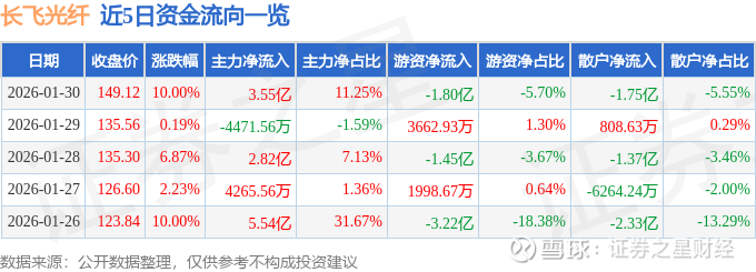 证券之星消息,长飞光纤1月30日涨停收盘,收盘价149.12元。该股于11点15分涨停,未打开涨停,截止收盘封单资金为1.36亿元,占其流通市值0.22%。