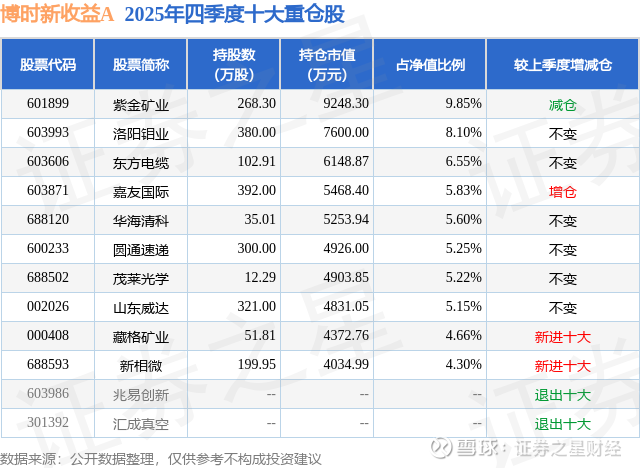 根据2025基金年报公募基金重仓股数据,重仓该股的公募基金共3家,其中持有数量最多的公募基金为博时基金的博时新收益A。博时新收益A目前规模为2.23亿元,最新净值1.9948(1月29日),较上一交易日下跌1.05%,近一年上涨87.89%。该公募基金现任基金经理为过钧。过钧在任的基金产品包括:博时信用债券A/B,管理时间为2009年6月10日至今,期间收益率为334.57%;博时双季鑫6个月持有混合A,管理时间为2021年1月20日至今,期间收益率为13.22%;博时浦惠一年持有期混合A,管理时间为2022年2月17日至今,期间收益率为34.01%。