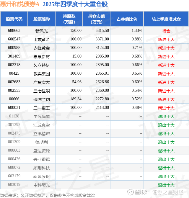 根据2025基金年报公募基金重仓股数据,重仓该股的公募基金共4家,其中持有数量最多的公募基金为惠升基金的惠升和悦债券A。惠升和悦债券A目前规模为43.48亿元,最新净值1.1026(1月29日),较上一交易日下跌1.0%,近一年上涨6.47%。该公募基金现任基金经理为曾华 孙庆。孙庆在任的基金产品包括:惠升和睿兴利债券A,管理时间为2021年3月23日至今,期间收益率为8.66%;惠升惠泽混合A,管理时间为2025年2月6日至今,期间收益率为46.55%;曾华在任的基金产品包括:惠升和赢纯债3个月定开A,管理时间为2022年9月9日至今,期间收益率为10.58%;惠升和裕纯债债券A,管理时间为2022年11月29日至今,期间收益率为11.67%;惠升和怡一年定开债发起式,管理时间为2022年11月29日至今,期间收益率为9.56%。