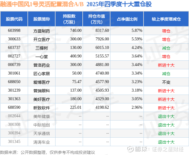 根据2025基金年报公募基金重仓股数据,重仓该股的公募基金共6家,其中持有数量最多的公募基金为融通基金的融通中国风1号灵活配置混合A/B。融通中国风1号灵活配置混合A/B目前规模为14.11亿元,最新净值2.596(1月29日),较上一交易日上涨0.35%,近一年上涨39.27%。该公募基金现任基金经理为万民远 程越楷。万民远在任的基金产品包括:融通健康产业灵活配置混合A/B,管理时间为2016年8月26日至今,期间收益率为151.1%;融通鑫新成长混合A,管理时间为2021年10月8日至今,期间收益率为37.09%;融通价值成长混合A,管理时间为2022年7月18日至今,期间收益率为36.25%;融通医疗保健行业混合A/B,管理时间为2023年3月15日至今,期间收益率为-18.36%。程越楷在任的基金产品包括:融通核心价值混合A,管理时间为2025年1月10日至今,期间收益率为48.92%;
