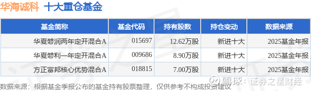 根据2025基金年报公募基金重仓股数据,重仓该股的公募基金共3家,其中持有数量最多的公募基金为华夏基金的华夏磐润两年定开混合A。华夏磐润两年定开混合A目前规模为1.78亿元,最新净值1.4547(1月29日),较上一交易日下跌1.09%,近一年上涨57.78%。该公募基金现任基金经理为张城源。张城源在任的基金产品包括:华夏磐泰混合(LOF)A,管理时间为2016年12月26日至今,期间收益率为83.99%;华夏磐利一年定开混合A,管理时间为2020年7月29日至今,期间收益率为111.03%;华夏磐锐一年定开混合A,管理时间为2020年12月22日至今,期间收益率为94.73%;华夏磐益一年定开混合,管理时间为2021年1月26日至今,期间收益率为66.37%。