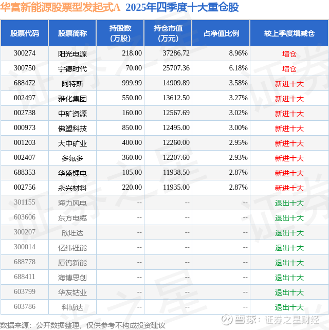 根据2025基金年报公募基金重仓股数据,重仓该股的公募基金共28家,其中持有数量最多的公募基金为华富基金的华富新能源股票型发起式A。华富新能源股票型发起式A目前规模为7.32亿元,最新净值1.2499(1月29日),较上一交易日下跌1.9%,近一年上涨78.23%。该公募基金现任基金经理为沈成。沈成在任的基金产品包括:华富科技动能混合A,管理时间为2022年8月22日至今,期间收益率为50.68%;华富产业升级灵活配置混合A,管理时间为2025年12月1日至今,期间收益率为12.13%。