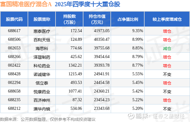 富国精准医疗混合A的前十大重仓股如下: