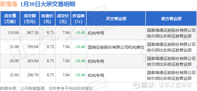 证券之星消息,1月30日珍宝岛发生大宗交易,交易数据如下: