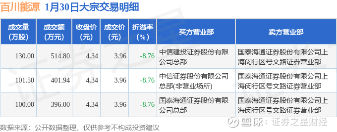 证券之星消息,1月30日百川能源发生大宗交易,交易数据如下: