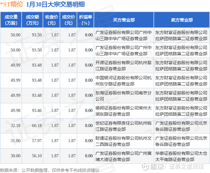 证券之星消息,1月30日*ST精伦发生大宗交易,交易数据如下: