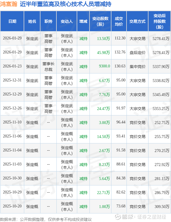 证券之星消息,根据1月30日市场公开信息、上市公司公告及交易所披露数据整理,鸿富瀚(301086)最新董监高及相关人员股份变动情况:2026年1月29日公司董事,高管张定武共减持公司股份59.48万股,占公司总股本为0.6609%。变动期间公司股价下跌5.43%,1月29日当日收盘报132.76元。