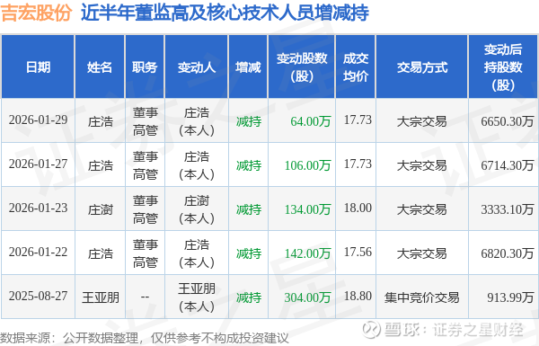 证券之星消息,根据1月30日市场公开信息、上市公司公告及交易所披露数据整理,吉宏股份(002803)最新董监高及相关人员股份变动情况:2026年1月29日公司董事,高管庄浩共减持公司股份64.0万股,占公司总股本为0.1421%。变动期间公司股价上涨1.07%,1月29日当日收盘报19.9元。
