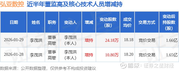 证券之星消息,根据1月30日市场公开信息、上市公司公告及交易所披露数据整理,弘亚数控(002833)最新董监高及相关人员股份变动情况:2026年1月29日公司董事,高管李茂洪共增持公司股份24.18万股,占公司总股本为0.057%。变动期间公司股价下跌0.05%,1月29日当日收盘报18.25元。