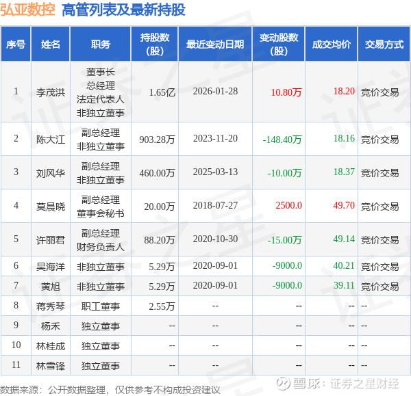 弘亚数控近半年内的董监高及核心技术人员增减持详情如下: